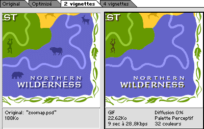 Étape 3. Contrôle des couleurs Web sécurisées. Pour savoir si votre image contient des couleurs non sécurisées pour le Web, choisissez le menu Affichage> Aperçu > Navigateur Dither. Repérez les zones de couleurs mouchetées ou tachées comme sur le fond de savane africaine de notre exemple. Ce phénomène se produit avec des couleurs qui ne sont pas intégrées aux deux palettes système Windows® et Mac OS. Ces couleurs forment la palette des couleurs Web et saffichent correctement dans un navigateur, quelle que soit la plate-forme.